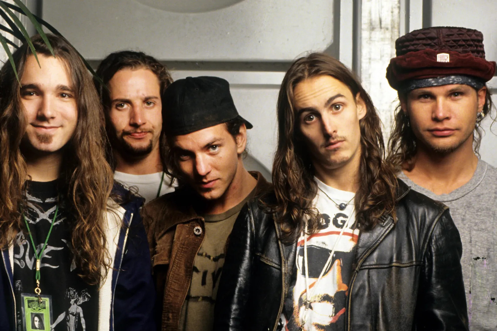 Pearl Jam, Eddie Vedder, Mike McCready, Jeff Ament, Stone Gossard, Dave Abbruzzese, Pinkpop Festival, Landgraaf, Holland, 08/06/1992. Gie Knaeps/Getty Images