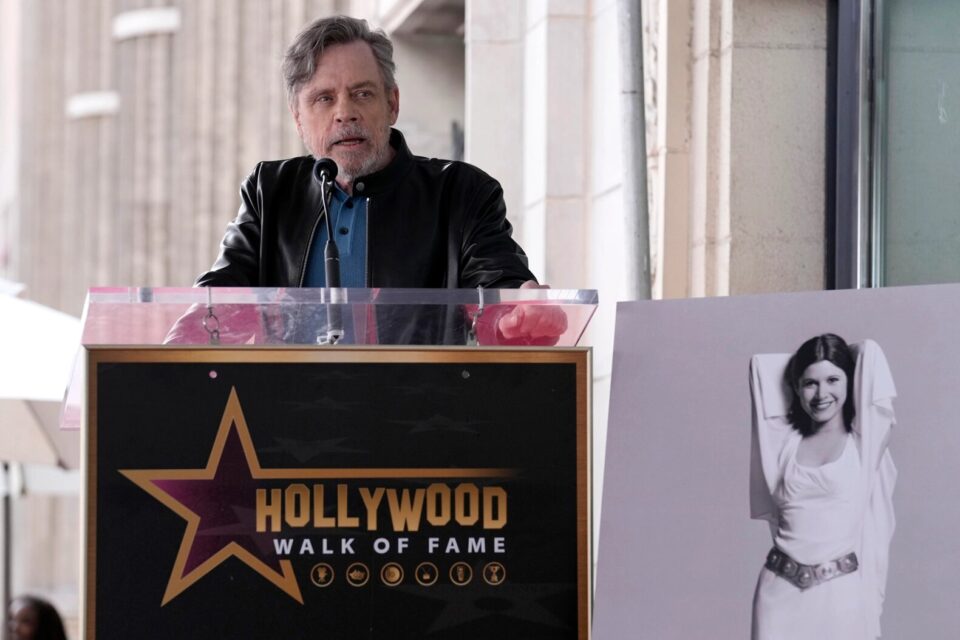 Mark Hamill speaks at a ceremony honoring the late actress Carrie Fisher, pictured at right, with a posthumous star on the Hollywood Walk of Fame in Los Angeles on Thursday, May 4, 2023. AP PHOTO/CHRIS PIZZELLO