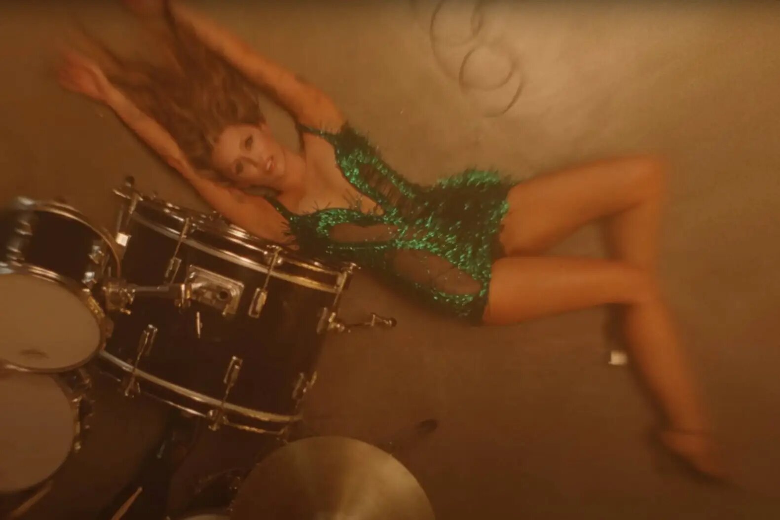 The “End of the World” visual opens with Cyrus performing on a soundstage reminiscent of her now-iconic 2024 Grammys performance. The video flashes between different shots of the singer lying in front of a drum set wearing an emerald green minidress as she feels herself.
