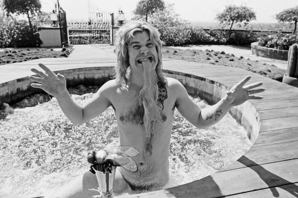 Ozzy Osbourne, former lead singer of Black Sabbath, pictured in his open air hot tub in the garden of his luxury home in Goldwater Canyon, Beverly Hills,California biting the head of a rubber chicken. 28th April 1982. Photo: Eddie Sanderson/Getty Images