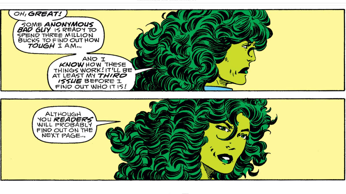 The comic-book version of She-Hulk has rarely had to worry about this. Despite the green skin and superstrength, she has occupied a relatively unique space within the Marvel universe. She is a Hulk who retains her own personality even when powered up(*). She is a lawyer whose specialty is cases involving other superheroes. Where most of her peers tend to treat their heroic identities as necessary evils they’d rather do without, she loves being the stronger, more confident, and more glamorous She-Hulk, and resents having to occasionally turn back to normal. And most importantly, she has largely been written as a comedy-forward character in what’s long been a very dark and angst-ridden medium, breaking the fourth wall to address her readers and acknowledge that she’s in a comic book years and years before Deadpool made that his gimmick.