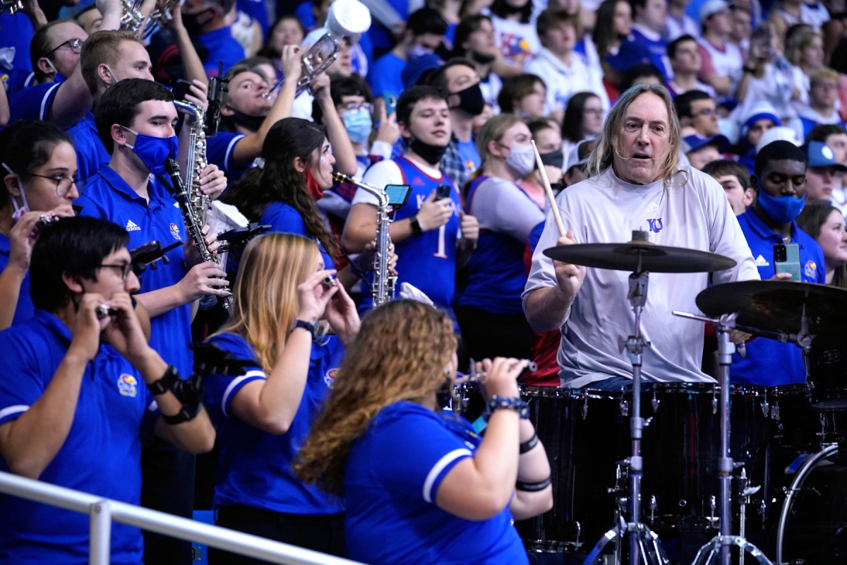 Carey, who was born in Lawrence, Kansas, was back in his hometown over the weekend to play drums with the University of Kansas band during the school basketball team’s game against one of their big rivals, the University of Missouri. Carey joined the school band for a cover of Jimi Hendrix’s “Fire.”